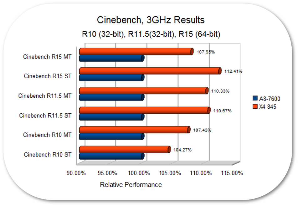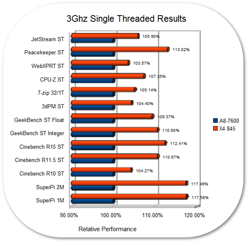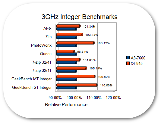 Stock-to-stock, the x4 845 is demonstrating 10.78% higher overall performance in this random selection of benchmarks - a very nice improvement, indeed.